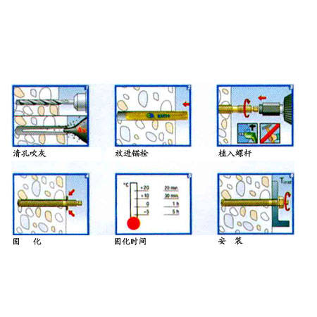钻孔—清孔—置入药剂管—钻入螺栓—凝胶过程—硬化过程—固定物体
